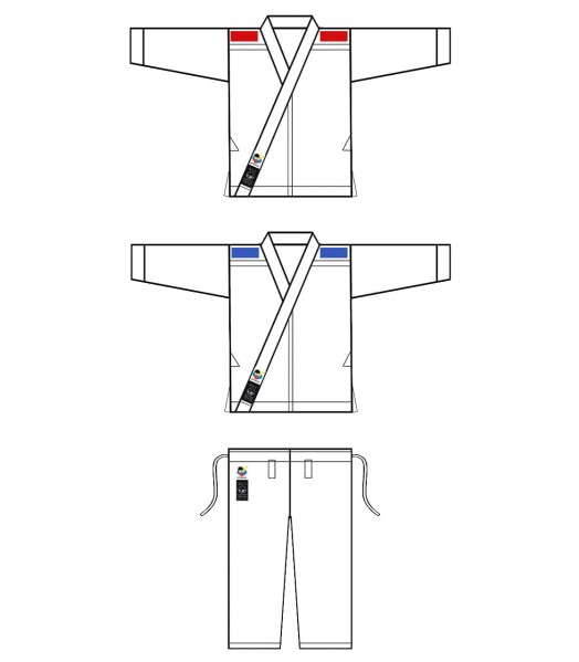Sada karate kimona, Tokaido Kata Master Duo, WKF (12 oz. Silver – Premier League). Sada: 2× kabát a 1× kalhoty. Toto vysoce kvalitní karate kimono nabízí maximální univerzálnost a pohodlí pro trénink i soutěže. Skládá se z kalhot a dvou kabátů (s červeným a modrým vyšíváním na ramenou), které umožňují rychlou výměnu podle požadavků soutěže. Karate-gi certifikované WKF • Středně těžký materiál • 100% bavlna. • Ideální pro kata soutěže. Používání karate kimon s označením „WKF Approved“ a vyšívaným logem na ramenou v červené a modré barvě je povinné na všech oficiálních akcích WKF (Mistrovství světa, Premier League, Series A a Youth League).
